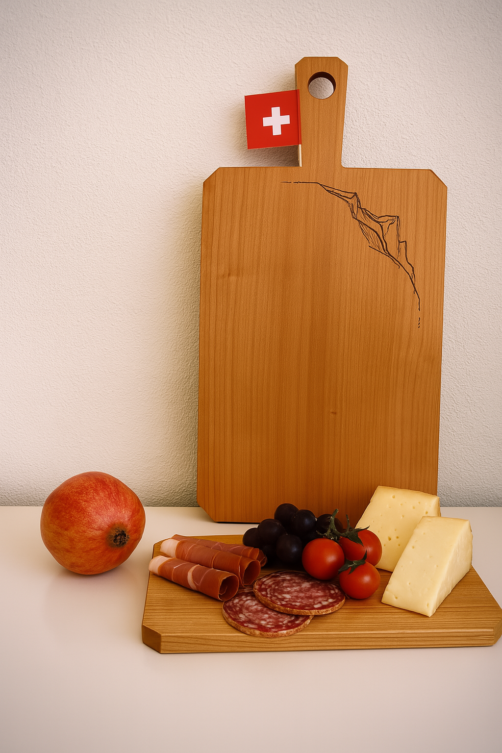 Dieses wunderschöne Holzbrett aus hochwertigem Schweizer Kirschholz ist nicht nur ein praktisches Küchenaccessoire, sondern auch ein Kunstwerk.